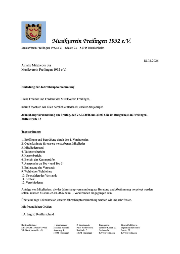 “Neuwahlen“…stehen am Freitag, 27. März 2026 auf der Jahreshauptversammlung des Musikvereins Freilingen um 20.00 Uhr im Bürgerhaus unter anderem auf der Tagesordnung. Dazu lädt der Vorstand alle Mitglieder, Freunde und Förderer ganz herzlich ein.