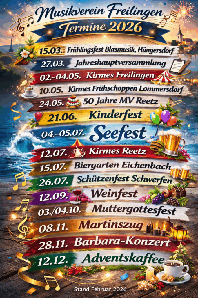 Hier findet ihr unsere kommenden Proben, Auftritte und Veranstaltungen. Ob Konzert, Aufmarsch oder Musik am See – alle wichtigen Termine des Musikvereins Freilingen stehen hier übersichtlich für euch bereit.